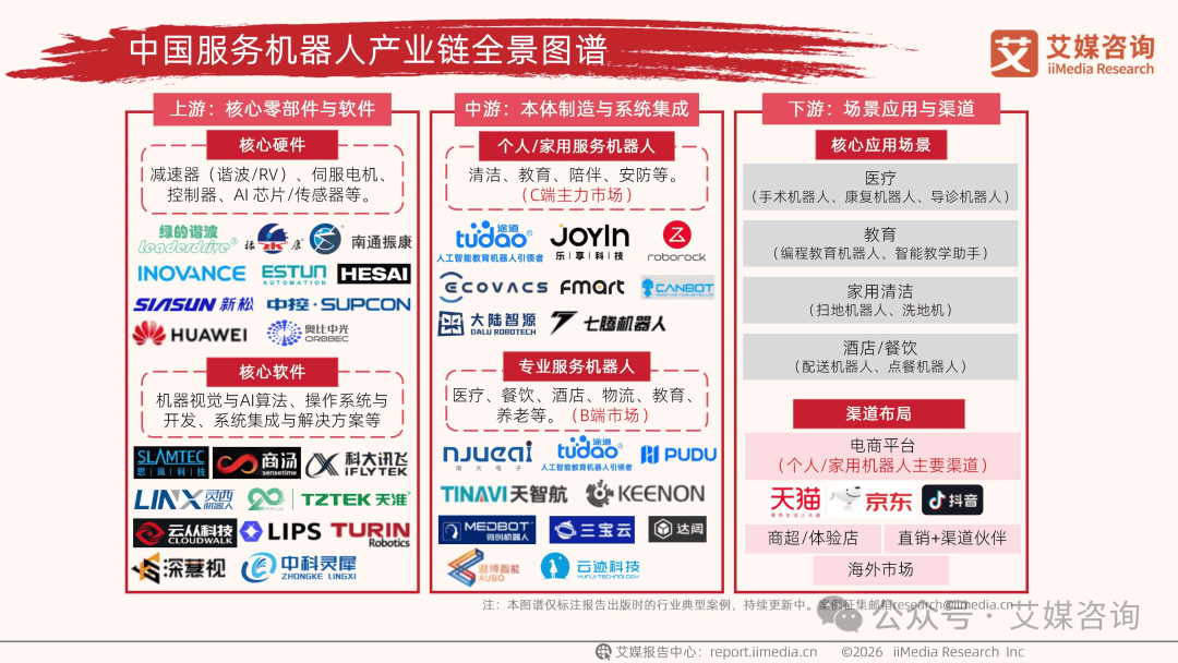 2025年中国服务型机器人行业市场规模达1850.1亿元,同比增长41.8%;扫地机器人市场规模157亿元,同比增长7.5%;教育机器人市场规模66.7亿元•●,同比增长3.6%。市场规模通常保持每年更新;如若更新,艾媒数据中心将第一时间发布
