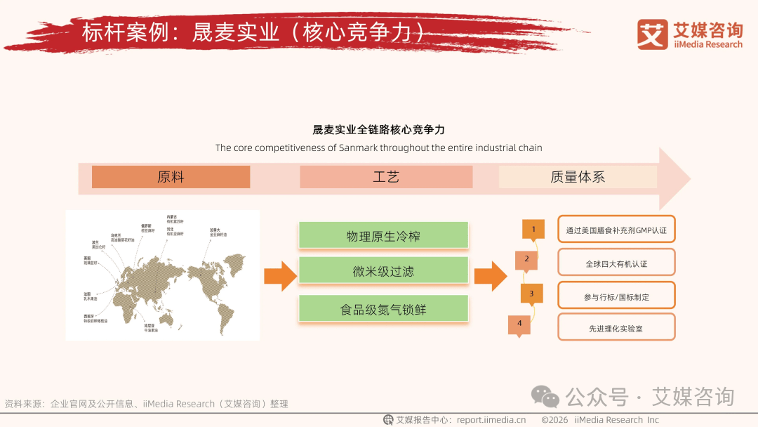 晟麦实业在原料、工艺、质量三大维度构建层层递进的竞争优势,支撑其产品覆盖40+国家、服务700+企业客户,领跑高端营养油脂全球市场。原料端,通过全球黄金产区直采(波兰黑加仑籽-……、肯尼亚牛油果等)结合国内10万余亩有机种植基地的全产业链布局,搭配十道净化筛查,从源头保障原料品质与供应稳定。在此基础上,以物理原生冷榨、微米级过滤、食品级氮气锁鲜三大核心技术,保留热敏性营养素,提升油烟点延缓氧化◁,实现营养与新鲜双重突破。为夯实品质壁垒•,其手握美国膳食补充剂GMP、全球四大有机等15项国际认证○,参与亚麻籽油国标制定,配备200+项检测能力的理化实验室▽◆,强化品牌公信力,最终构筑起全链路核心竞争力。