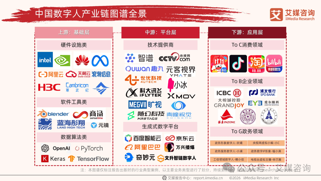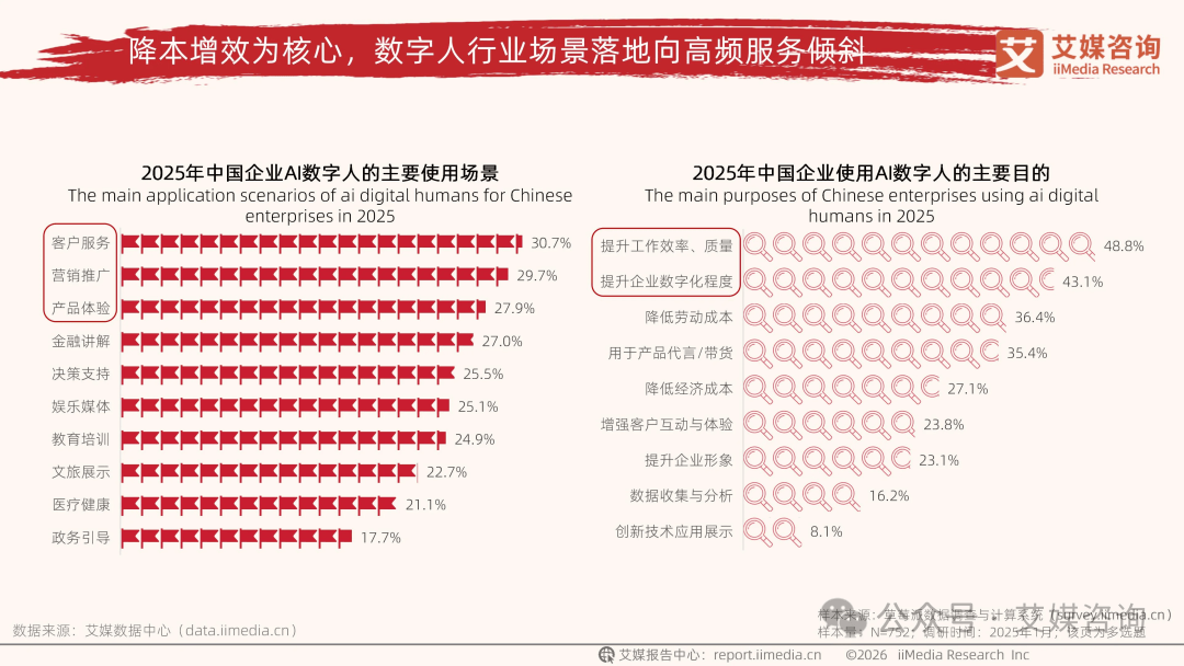 30=.7%)、营销推广(29….7%)▲-、产品体验(27.9%)位列场景前三▽▪☆,聚焦于高频服务场景,体现出企业会优先将AI数字人应用于直接触达客户、转化价值的前端环节。在应用目的方面=,效率与数字化转型为核心诉求。中国数字人产业链图谱全景