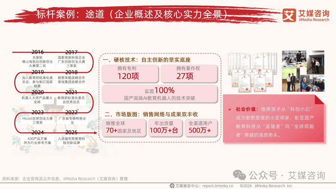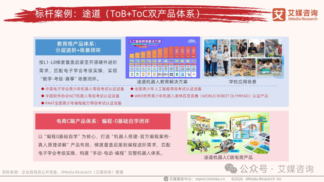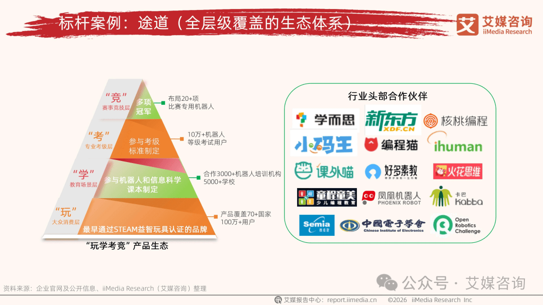 -学-考-竞”四层级市场布局,覆盖大众消费、教育场景☆▪、专业考级及赛事竞技全领域▲=…。大众消费层,作为最早通过STEAM益智玩具认证的品牌,其产品已触达超70个国家,累计突破100万用户,实现全球化大众市场渗透;教育场景层▪▽,深度参与机器人与信息科学课本编制,跻身基础教育核心教具供应商阵列;专业考级层,主导考级标准制定□-,在行业标准化与考级服务领域树立权威;赛事竞技层△,凭借多项赛事冠军,筑牢专业竞技领域的产品与成绩壁垒=◆▪。标杆案例:途道(