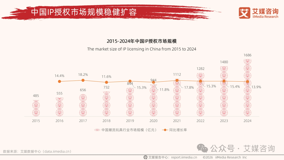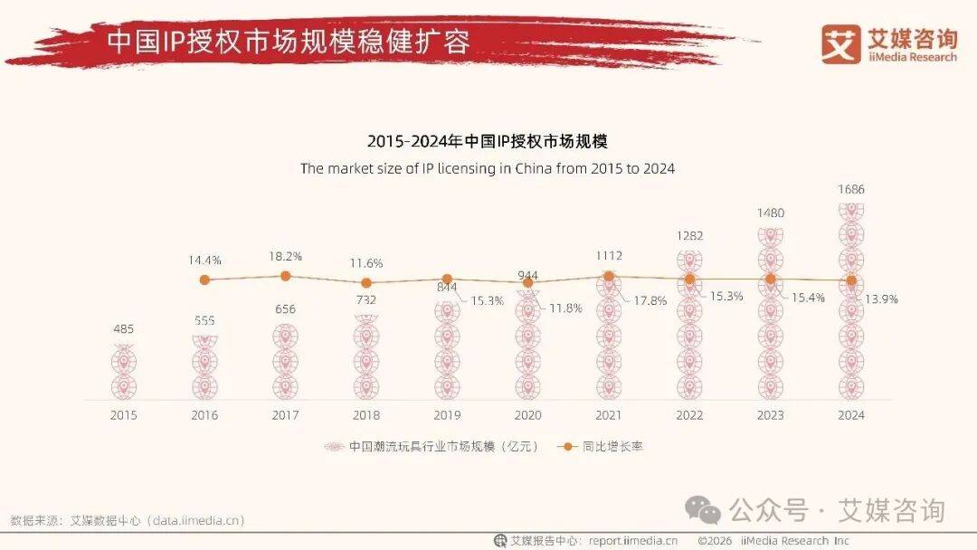 在消费端,Z世代与Kidult文化崛起,精神消费需求激增,IP成为情感连接的核心载体。在供给端,IP孵化体系成熟,头部企业构建IP全链条运营能力,推动中国IP授权市场规模稳健扩容,IP化也成为潮玩增长的核心引擎•★。