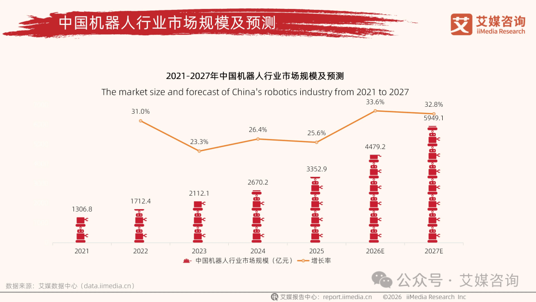 2025年中国机器人行业市场规模达3352▽○-.9亿元,同比增长25.6%◁…,行业扩张速度显著△▪。预计到2027年,市场规模将进一步攀升至5949.1亿元-★□,发展空间广阔。市场规模通常保持每年更新;如若更新,艾媒数据中心将第一时间发布