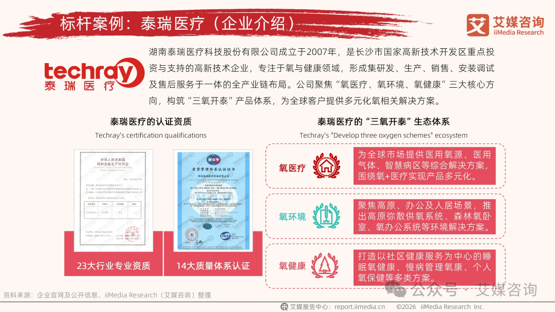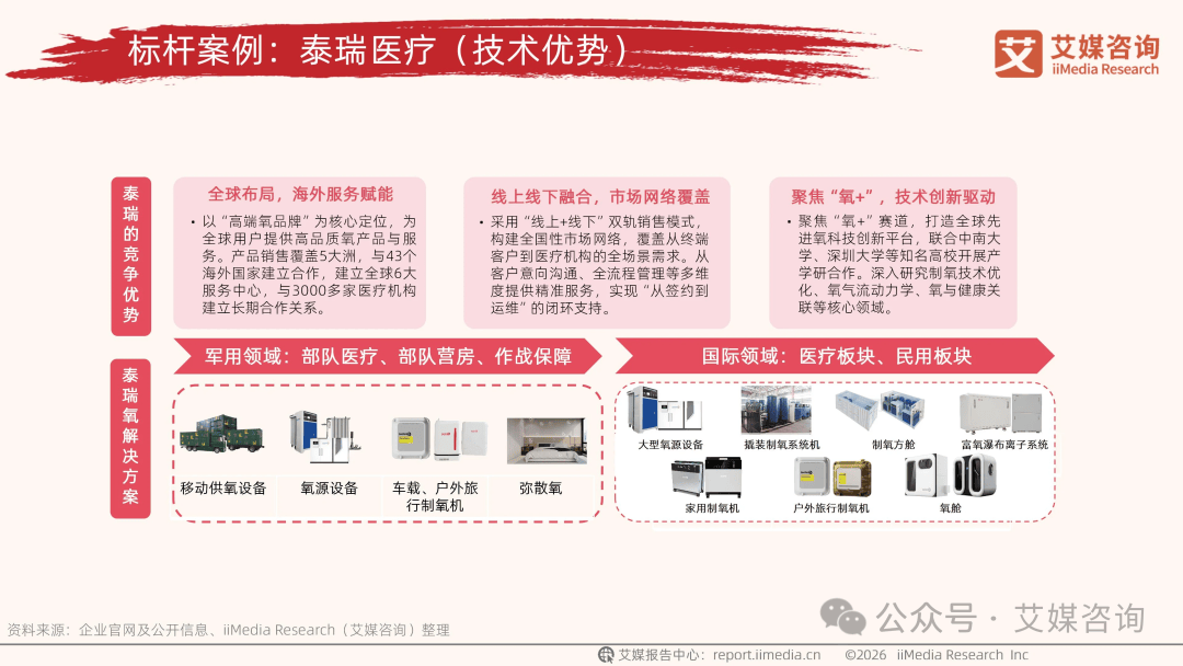 泰瑞医疗在氧气领域产品矩阵丰富,覆盖军用、医疗、民用、特殊环境等多场景需求,同时依托强大的研发与生产实力,保障产品品质与技术领先性。产品层面◁•,既为医疗机构提供专业医用制氧解决方案,也针对基层医疗、高原环境、高端人居等场景推出定制化产品;实力层面◁,通过自主研发与产学研合作构建技术壁垒,搭配标准化生产基地与完善的资质认证体系,形成稳定的核心竞争力,业务已遍及全球43个国家及地区,服务3000多家医院及相关单位。