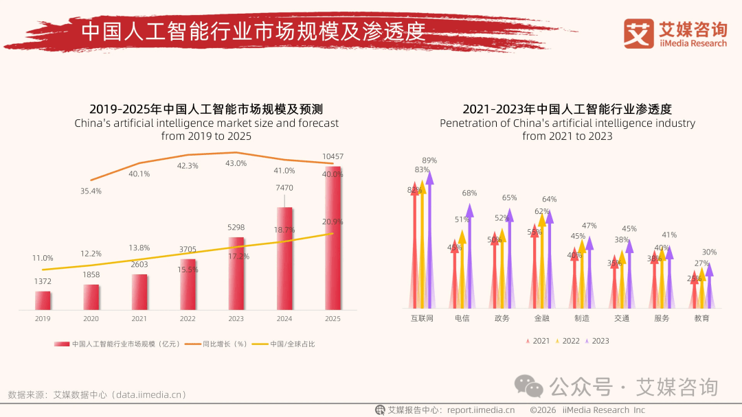 技术对各行各业的渗透率在不断提升,应用场景广泛。数据显示,2024年中国人工智能行业市场规模达7470亿元,同比增长41.0%,2025年达10457亿元,占全球比重达20.9%。相较2021年,2023年中国人工智能在互联网(89%)、电信(68%)、政务(65%)、金融(64%)等领域的渗透率明显提升。市场规模通常保持每年更新●★;如若更新○▽,艾媒数据中心将第一时间发布