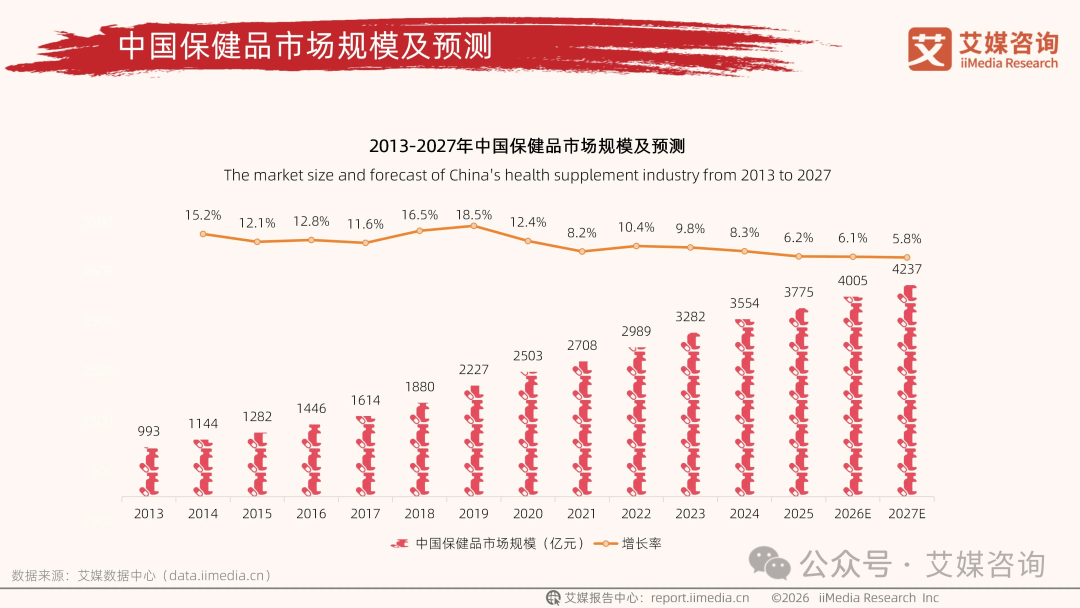 iiMedia Research(艾媒咨询)数据显示,2025年中国保健品市场规模达到3775亿元△,同比增长6.2%。行业增长势能稳健释放,预计2027年这一规模将达到4237亿元。