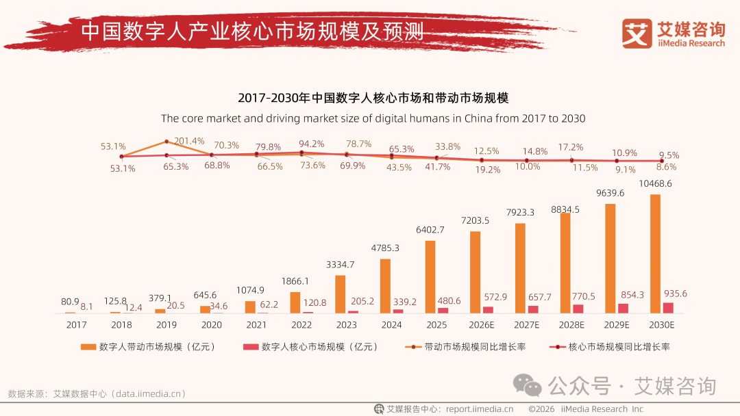 端市场(学校/机构)、以消费线产品触达C端家庭,形成“ToB教育筑基+ToC消费放量+赛事品牌拔高”的三维增长引擎。中国数字人产业核心市场规模及预测