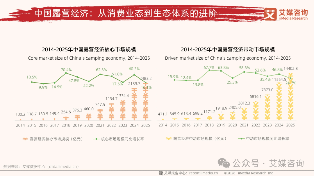iiMedia Research(艾媒咨询)数据显示◇,2025年中国露营经济核心市场规模达2483.2亿元,同比增长16.1%◁;带动市场14402.8亿元□•,同比增长24.7%。露营经济进入“核心扩容+全域带动”的成熟发展阶段。核心市场的增长是基础动力,带动市场的爆发则体现了露营经济对关联产业的辐射能力,二者共同推动露营从单一消费业态升级为复合型经济生态。