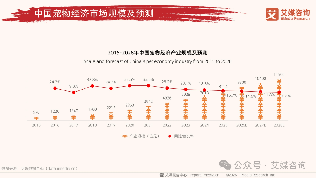 iiMedia Research(艾媒咨询)数据显示,中国宠物经济产业规模呈现逐年上升的趋势-◆◁,2025年中国宠物经济产业规模达到8114亿元▽◇,同比增长15.7%;预计2028年将达11500亿元○。艾媒咨询分析师认为,在经济基础巩固、家庭结构变革、科技文化进步的背景下,国内市场空间广阔、企业出海优势凸显•、国家积极保障等诸多因素的推动下◆•▼,宠物产业规模将在较长一段时间保持稳健增长▼◆,宠物产业链薄弱环节将获得较快增长•。