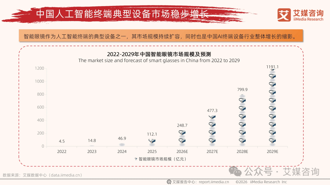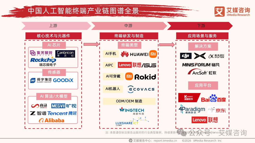 iiMedia Research(艾媒咨询)数据显示,续航能力(61.3%)和舒适度(56□….0%)占据关注因素前两位,远超其他指标,说明智能眼镜作为穿戴设备,消费者最看重长期使用的基础体验。中国人工智能终端产业链图谱全景