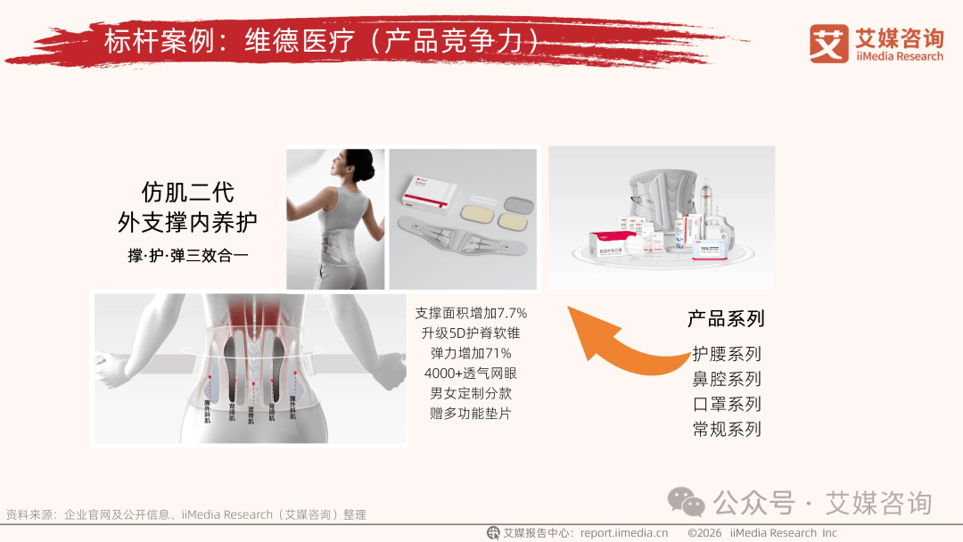 维德医疗构建起全面覆盖护腰类、口罩类••、鼻腔类▪、常规类的多元产品矩阵,以此精准触达家庭健康护理的各类需求。在此基础上,公司依托创新技术实现细分品类突破,推出核心单品仿肌肉群支撑护腰,该产品凭借贴合人体工学的设计与精准的支撑功能,成为细分领域的亮眼存在。这款核心单品的优势•●-,结合全品类坚守的医级品质标准与全产业链支撑,共同构筑起维德医疗的产品竞争力。