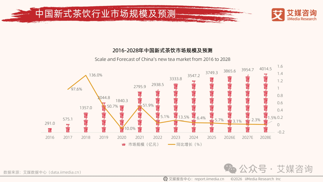 iiMedia Research(艾媒咨询)数据显示,2025年中国新式茶饮市场规模达3749◇.3亿元,同比增长5.7%。新式茶饮行业已从初期的快速扩张☆▼▷、激烈争夺份额的“跑马圈地●=”阶段过渡至注重精细化运营的存量竞争新阶段。新式茶饮产品同质化现象突出,行业内卷加剧,市场空间趋于相对饱和状态,预计未来几年中国新式茶饮市场规模将维持小幅但稳定的增长态势,到2028年有望突破4000亿元。