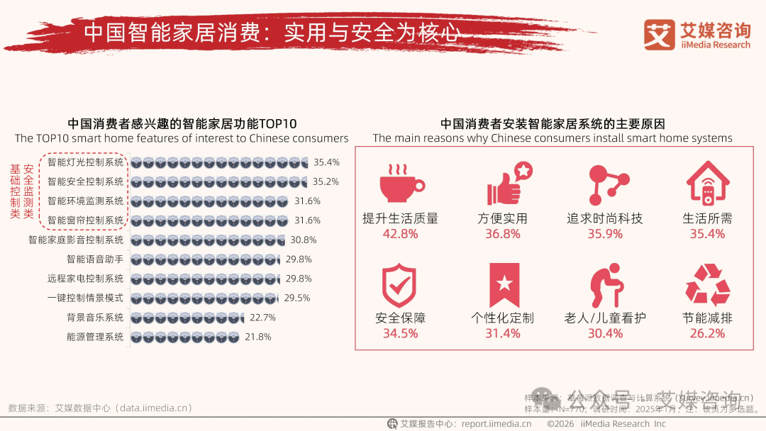 iiMedia Research(艾媒咨询)数据显示,从消费者感兴趣的智能家居功能占比来看,基础控制类、安全监测类功能占据主流,复杂娱乐类◇、能源管理类功能关注度相对较低,反映出消费者对智能家居的核心期待是“简化生活流程、保障居家安全◆”▽。在消费者安装智能家居系统的主要原因中▽▽,▪★“提升生活质量○”是首要驱动力,其次为方便实用,这表明智能家居已从▪•-“科技潮品”转变为“改善生活的必备工具☆△”。