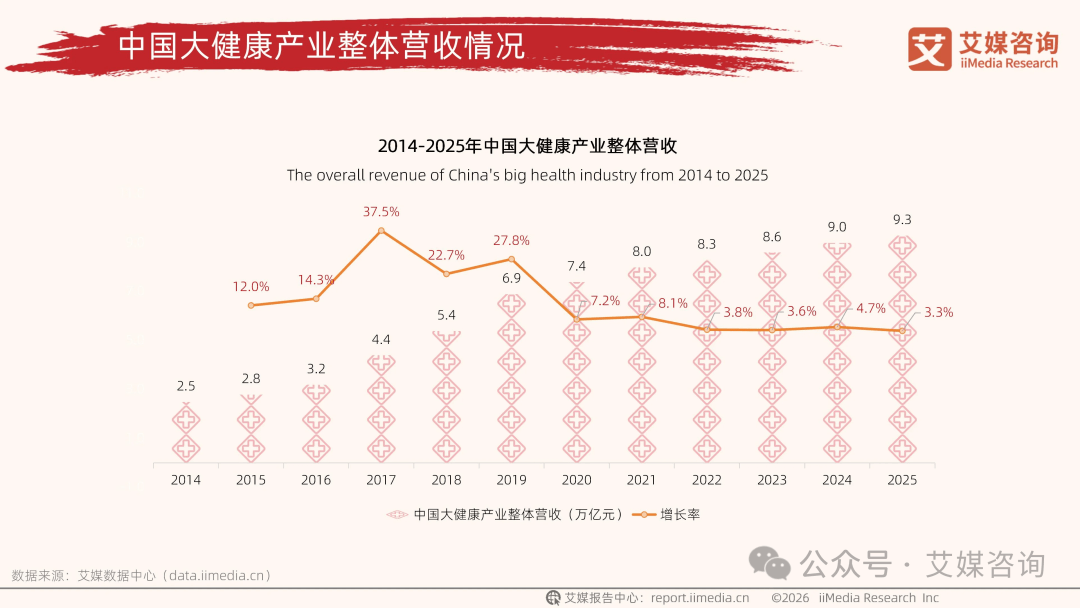iiMedia Research(艾媒咨询)数据显示,2025年中国大健康产业整体营收达到9.3万亿元•,同比增长3.3%。随着人口老龄化加速、居民健康意识提升、政策持续加码的多重驱动下,产业增长韧性凸显◆▪,结构升级趋势将愈发显著■-◇。