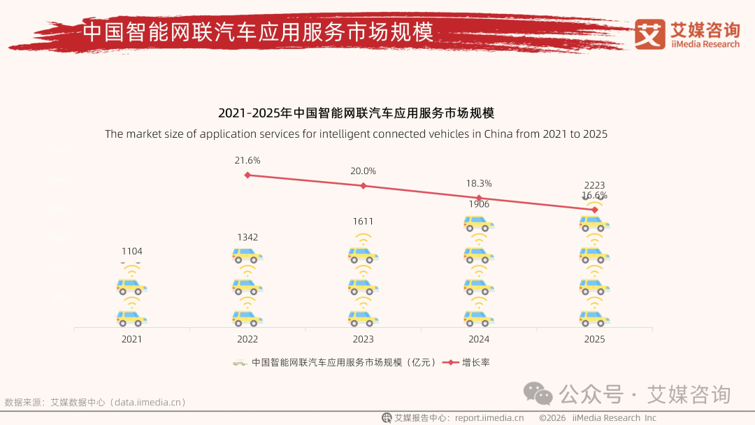 2025年中国智能网联汽车应用服务市场规模约为2223亿元,同比增长16.6%。依托智能座舱▪◁▷、车联网、自动驾驶数据服务等核心场景的持续渗透△,智能网联汽车应用服务市场将持续保持扩容态势▼=△。市场规模通常保持每年更新;如若更新◇=,艾媒数据中心将第一时间发布