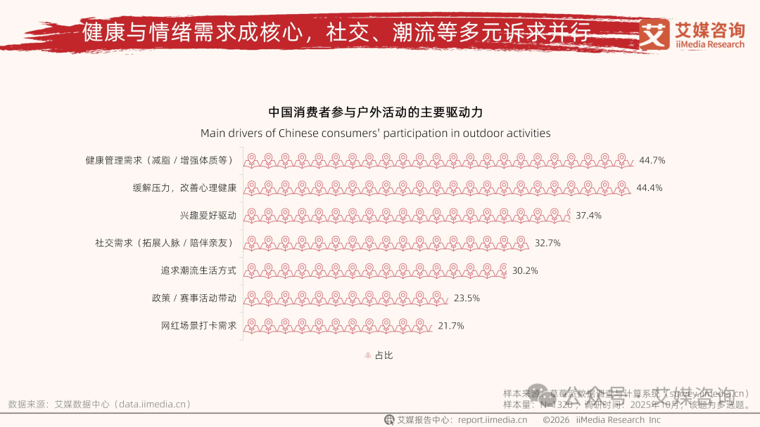 户外活动已成为消费者维持健康状态、应对生活压力的重要方式。同时▪,兴趣与社交也是重要辅助动力,既满足个人兴趣偏好,也承载了拓展人脉、陪伴亲友的社交功能◇◁。