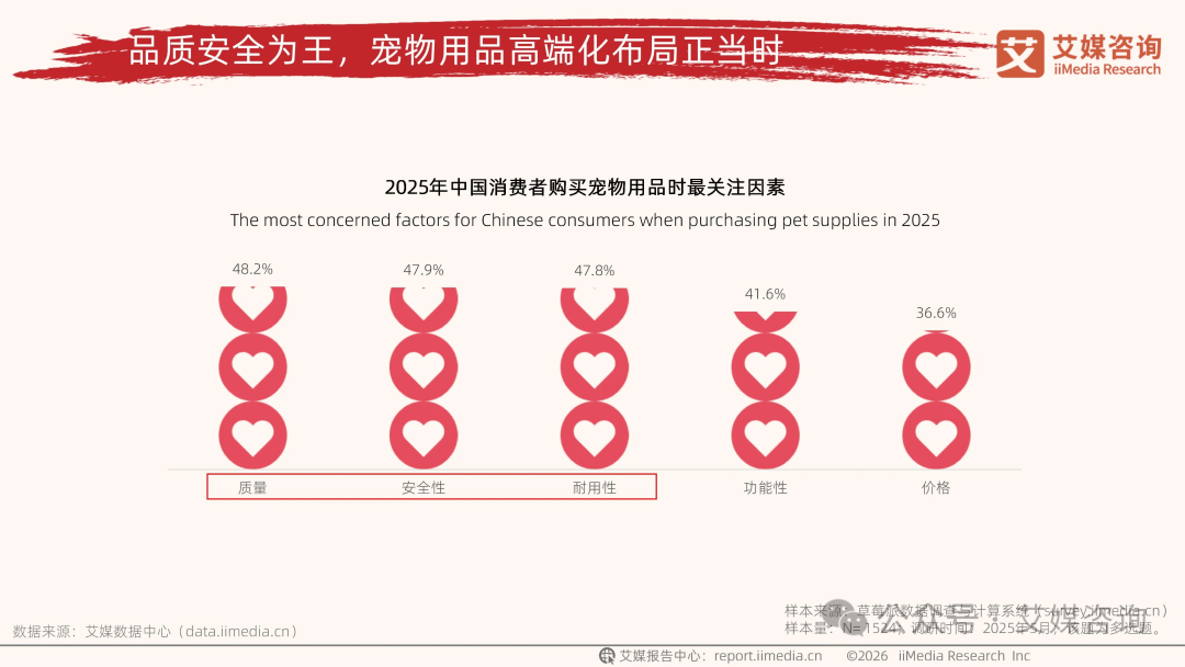 iiMedia Research(艾媒咨询)数据显示,消费者购买宠物用品时最关注质量•、安全性△、耐用性,分别占比48◁.2%、47□◇.9%、47.8%。消费者对价格的关注度较低,仅占36.6%◁■。艾媒咨询分析师认为●,消费者对高质量的宠物用品付费意愿较强▪,企业可增加高端宠物用品品类,通过提供高品质服务★□●、打造品牌特色等方式提升产品附加值。