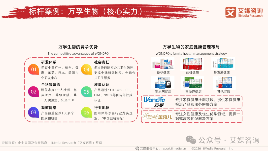 万孚生物现有免疫胶体金技术平台、免疫荧光技术平台☆、电化学技术平台、干式生化技术平台▷…△、化学发光技术平台◁、分子诊断技术平台、病理诊断技术平台●,以及仪器技术平台和生物原材料平台,依托这九大核心技术平台●▪,形成多场景诊断解决方案,覆盖临床医疗、家庭健康、公共卫生等领域。将医疗级产品应用到个人和家庭场景●▽▲,旗下品牌包括专业与消费端“Wondfo万孚”和消费端“Kingsuer金秀儿◆”,涉及备孕健康■◇、两性健康•▼、呼吸道健康、糖尿病健康、胃肠道健康及其他健康管理六大解决方案-,助力改善人口健康◆☆-。