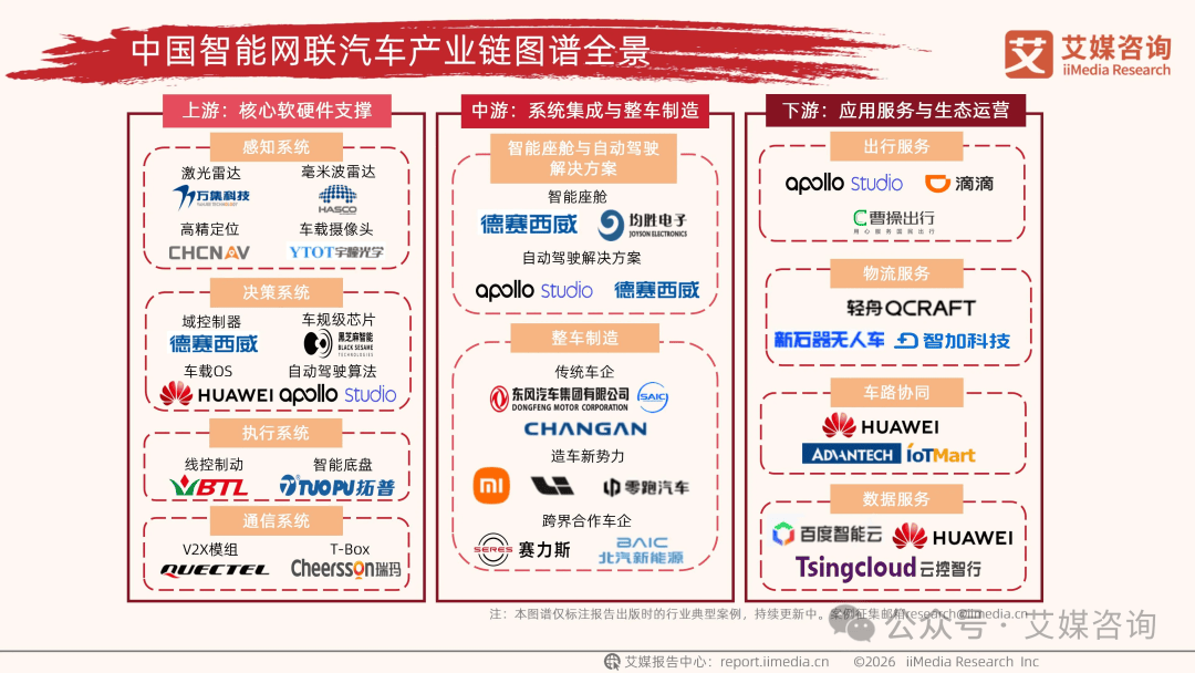 与感知决策技术的融合应用将成为新的消费增长点,进一步推动智能网联汽车从☆◇▽“辅助驾驶□”向☆◆“高阶智能出行□”升级。中国智能网联汽车产业链图谱全景