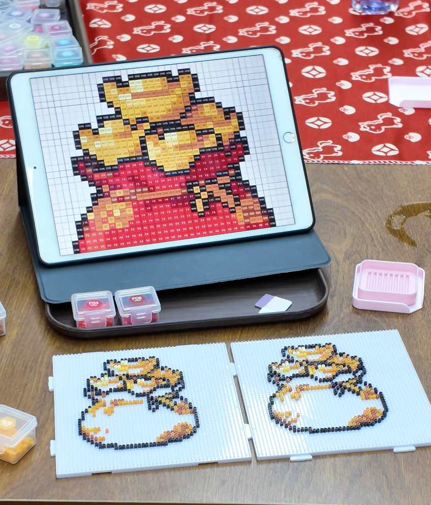 在广州一家名为“万物皆可拼”的拼豆体验店内,下午3点刚过,十余张工作台已座无虚席。顾客们低头专注地用镊子将一颗颗彩色塑料豆嵌入模板,有人拼的是喜欢的小物件,有人复刻童年动画片中的经典形象,还有人在为朋友婚礼定制手作拼豆礼物。店员小麦一边熨烫成型的作品,一边对记者说:“高峰期我们几乎一直在熨,根本停不下来。”