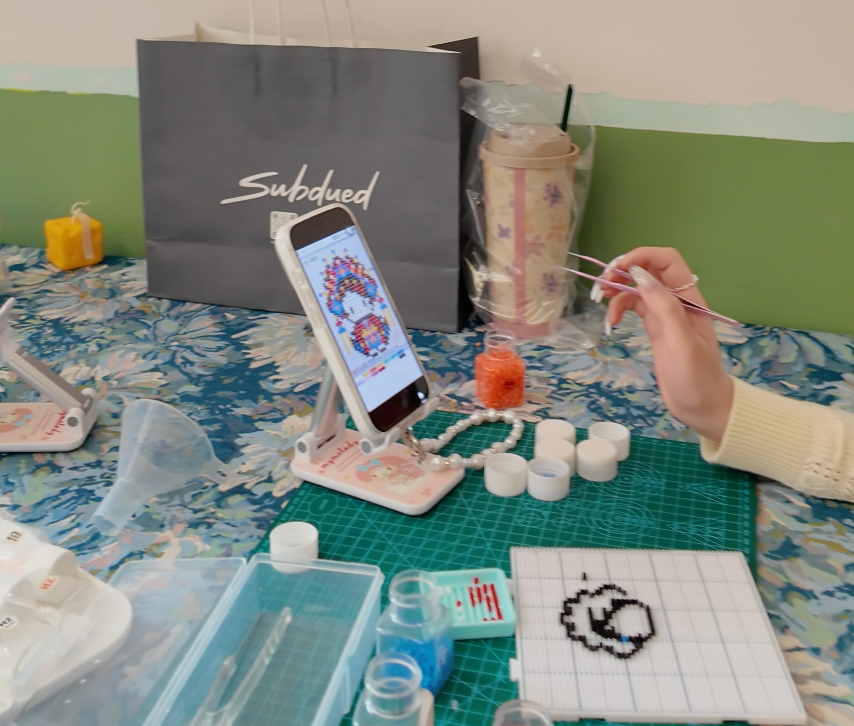 消费者小陈是典型用户画像——大学生,因室友接触拼豆后入坑,目前已拼出多个作品,冰箱贴全是自制。“大概两个月来一次,单次消费50元以内。很解压,拼完特别有成就感。”她拼一个大图耗时两个半小时,“像这个是要做成开关装饰的,放在家里看着心情就好。”小陈指着一张构色非常复杂的拼豆作品。